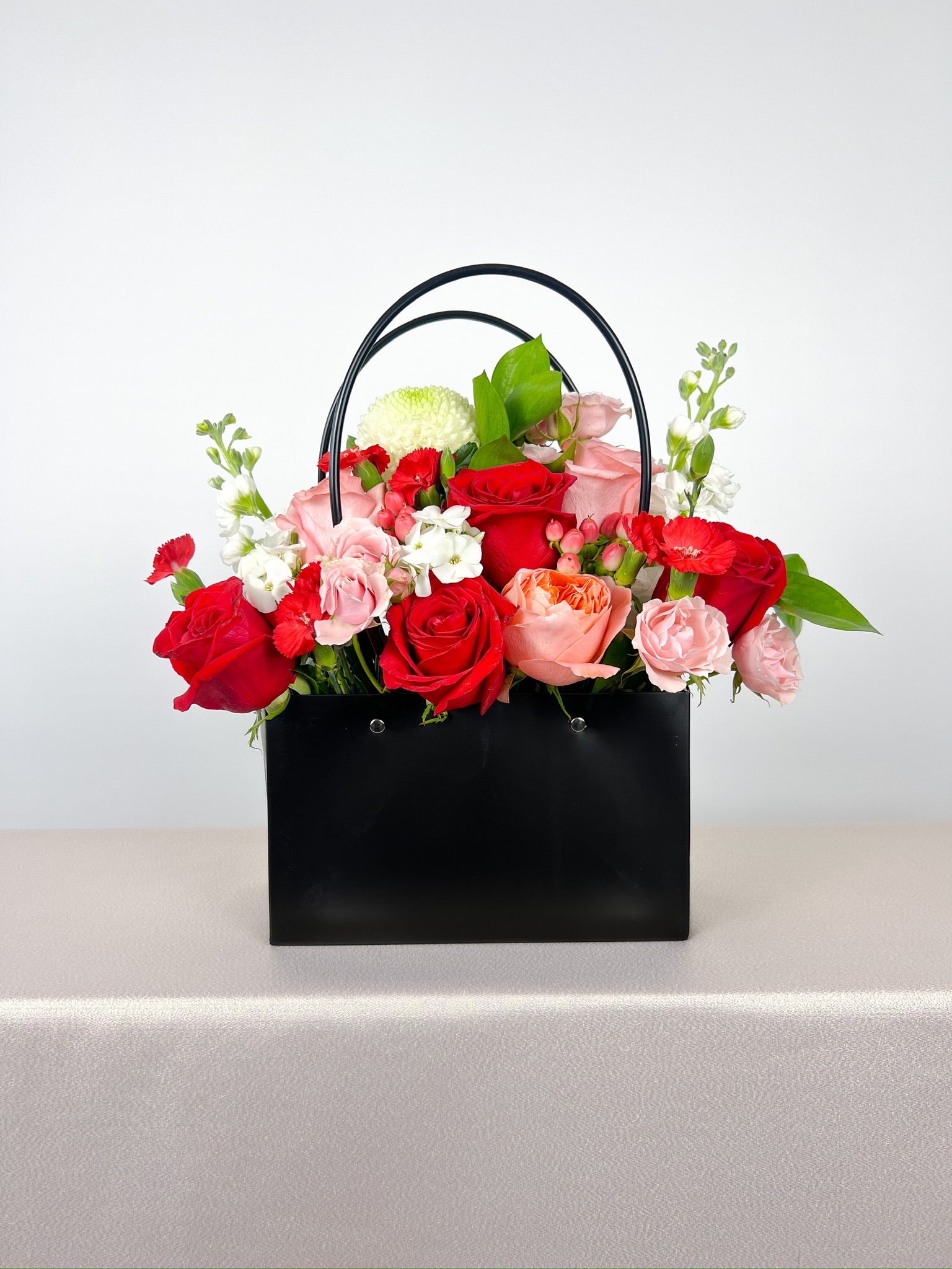 Red and blush pink roses, paired with seasonal blooms and greenery, arranged in a black floral tote. A bold and romantic statement.