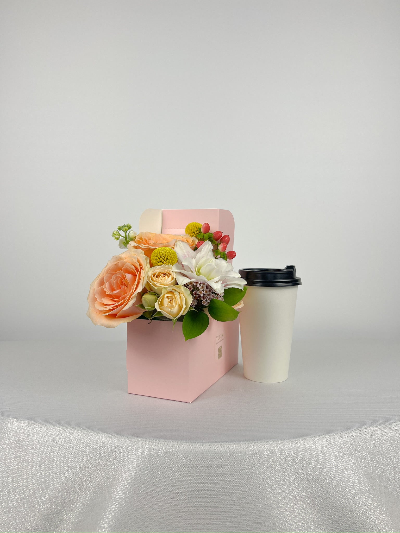 A petite arrangement of fresh blooms in soft peach and cream tones, paired with a cup of coffee. A charming gift box for any occasion.