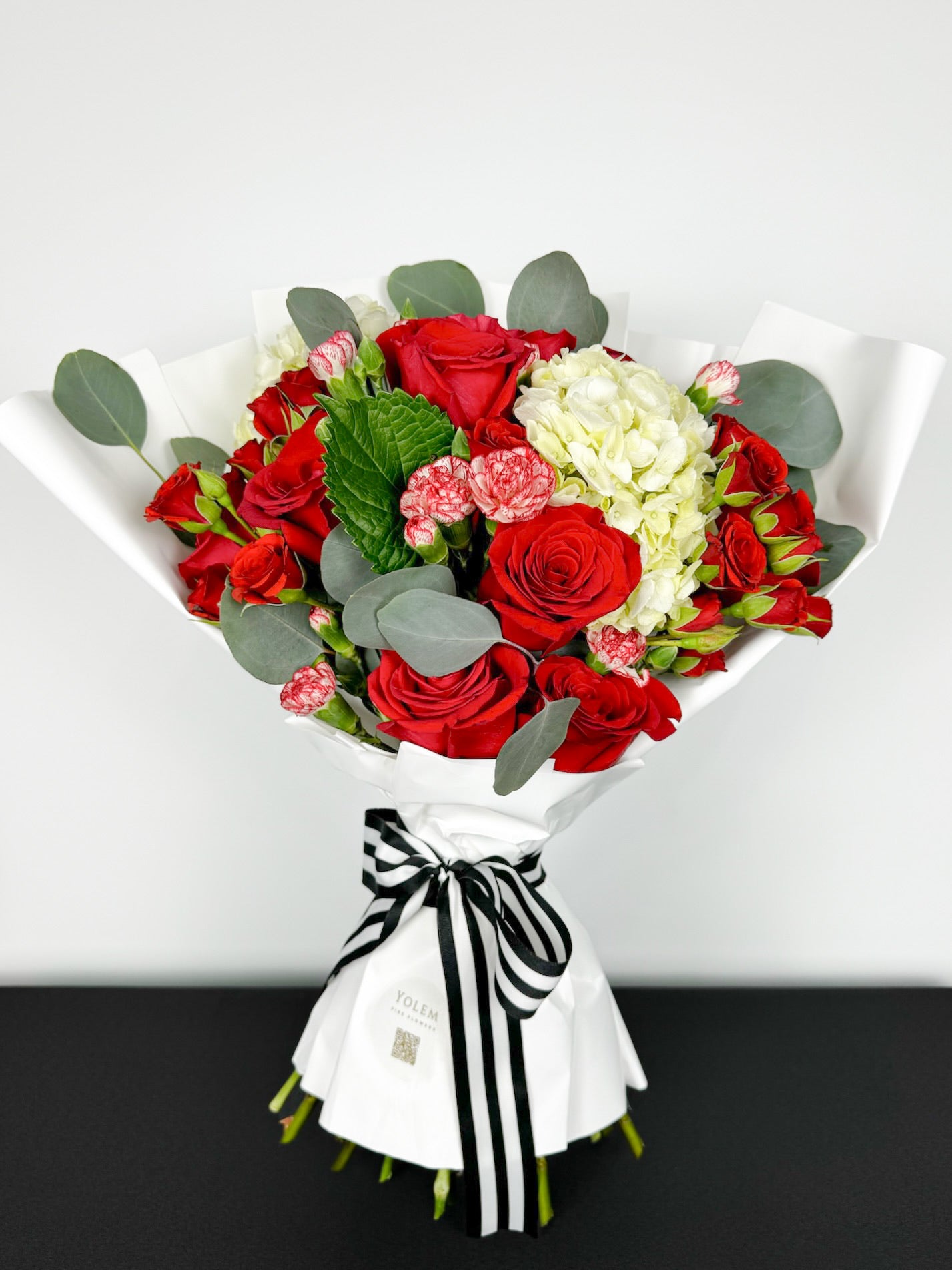 A classic bouquet of red roses, white hydrangeas, and variegated carnations, wrapped in white with a bold striped ribbon for a timeless, elegant look.